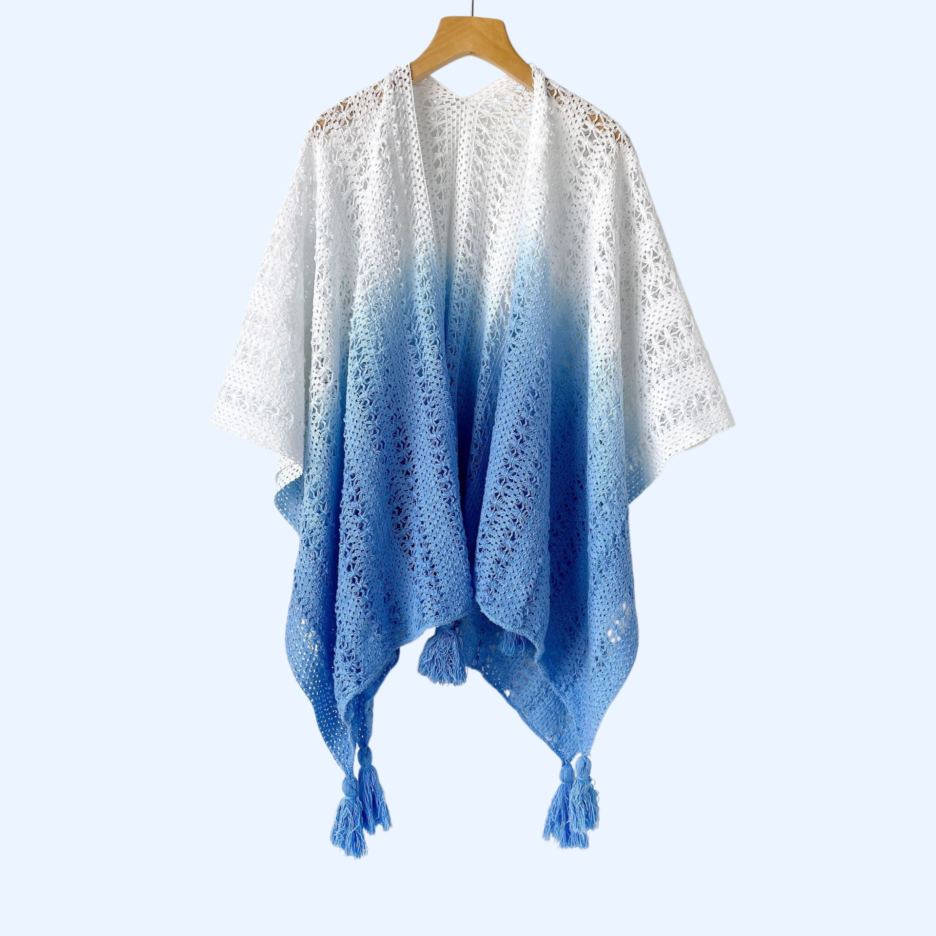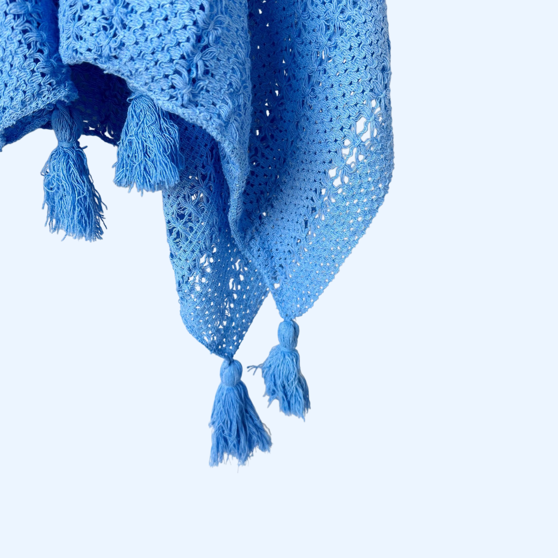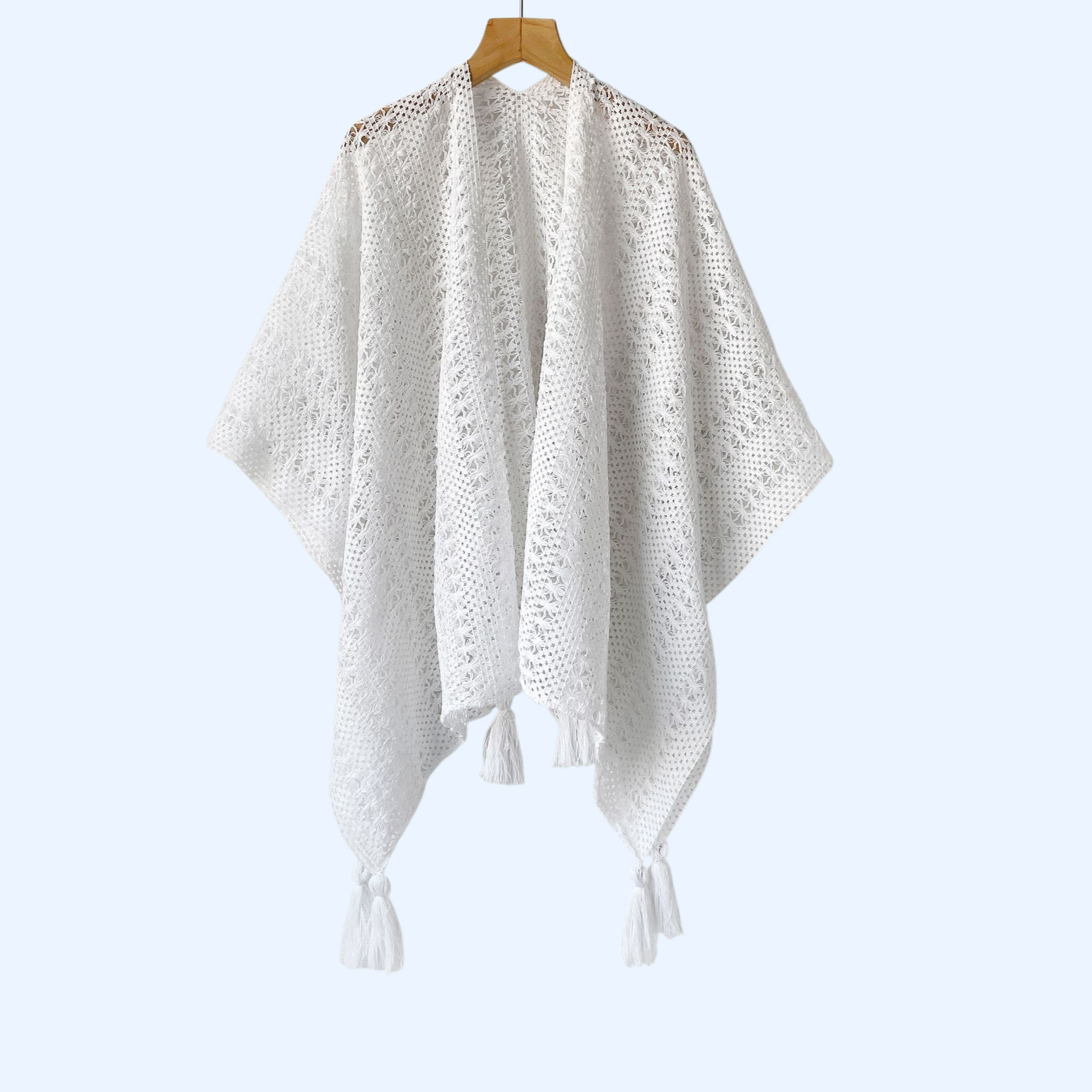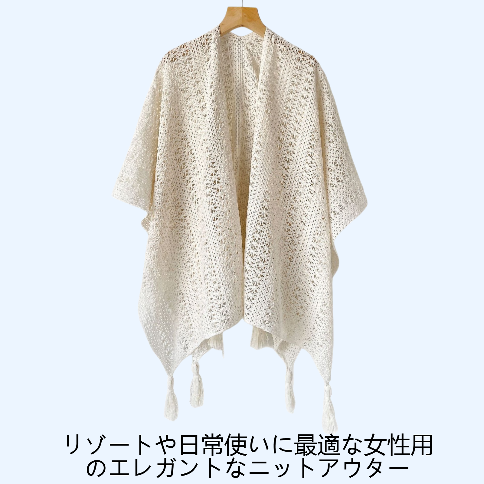 軽やかな透かし彫りデザインで通気性抜群。リゾートや日常使いに最適。大判マフラーとしても活用可能。持ち運び便利。