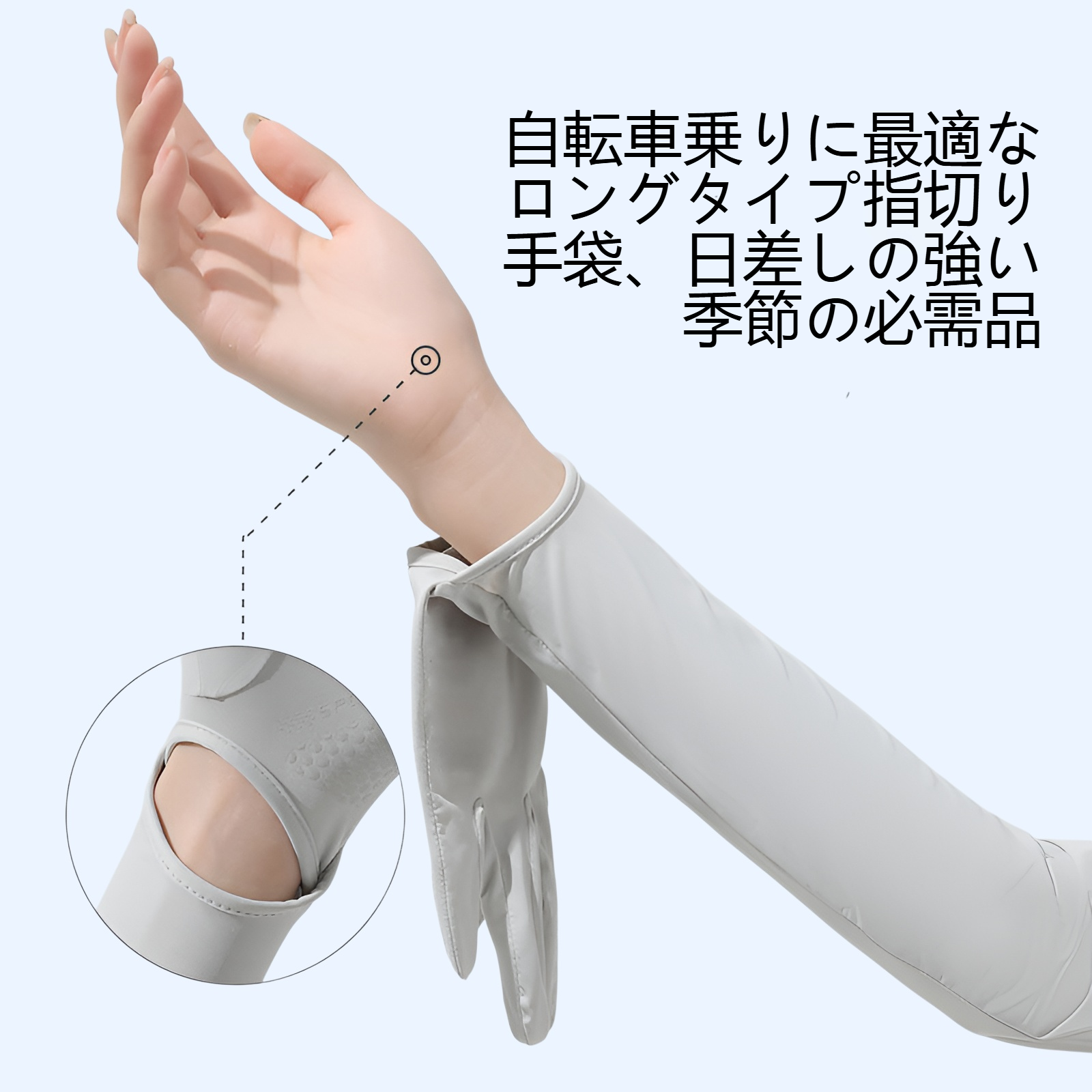 UVカット率99%、通気性素材、冷感加工、指穴付き設計、伸縮性抜群、着脱簡単、アウトドアや通勤に最適な夏用レディース日焼け止めスリーブ。